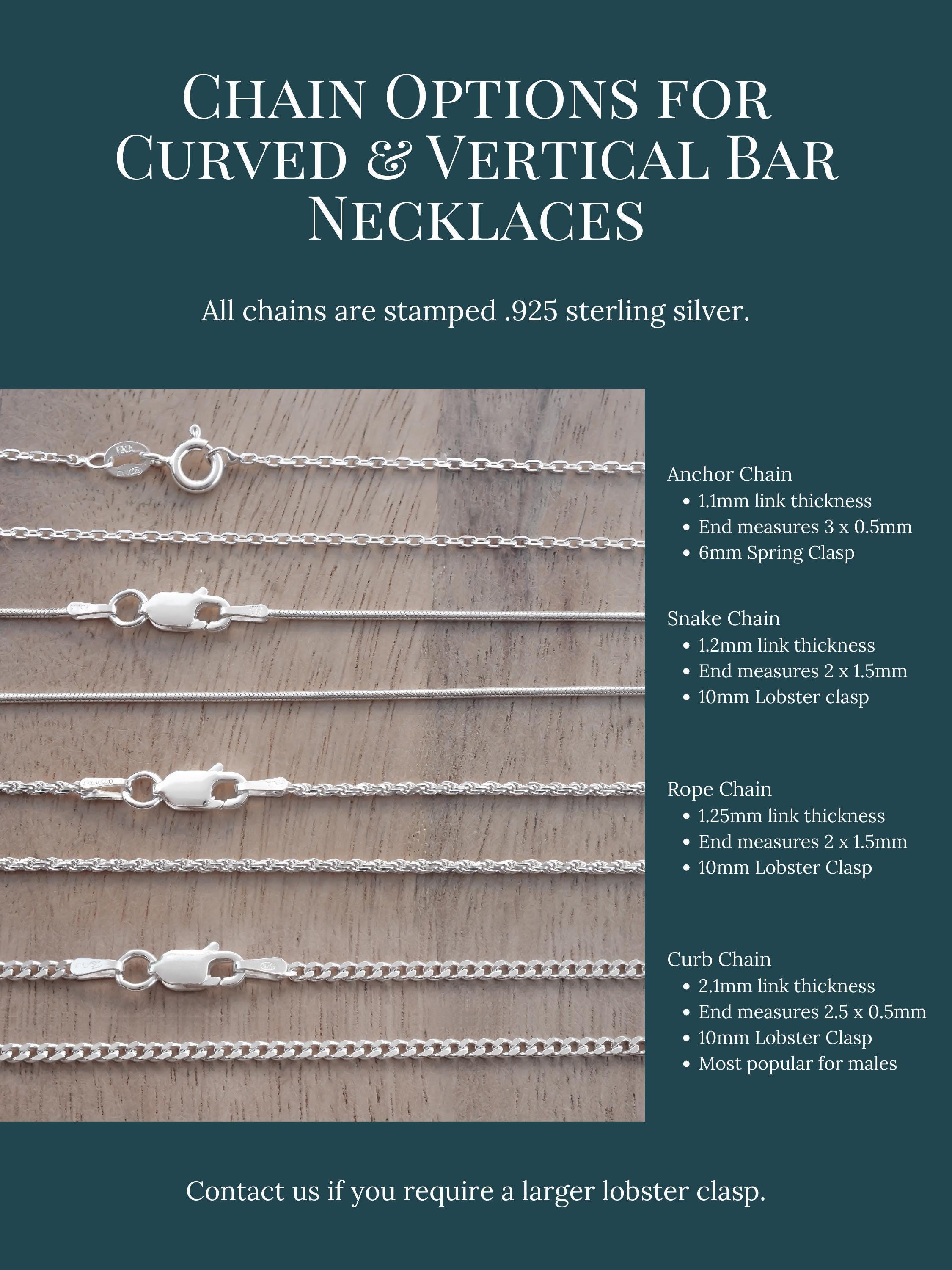 The curved bar and vertical bar charm necklaces on th eir own come with one of the clasps shown in the chain options photo.