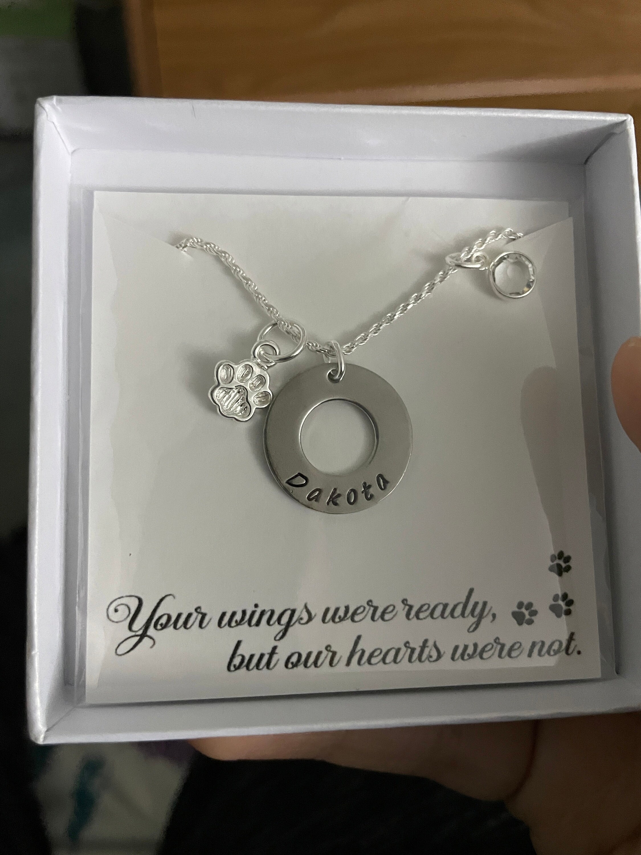 The dog memorial necklace beat my expectations. we lost our family dog of 10 years and I ordered this for my daughter. It was packaged nicely and areived fast. Thank you for making such a beautiful item to remember a lost pet 💛